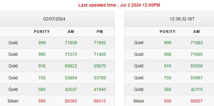 इंडिया बुलियन एंड ज्वैलर्स एसोसिएशन (India Bullion And Jewellers Association) के मुताबिक, मंगलवार की शाम को 24 कैरेट का शुद्ध सोना 71692 रुपये प्रति 10 ग्राम था, जो आज (बुधवार) सुबह महंगा होकर 71983 रुपये पहुंच गया है. इसी तरह शुद्धता के आधार पर सोना और चांदी महंगी हुई है.