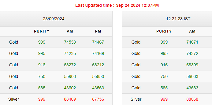 | शुद्धता | सोमवार शाम के रेट | मंगलवार सुबह का भाव | कितने बदले रेट | |