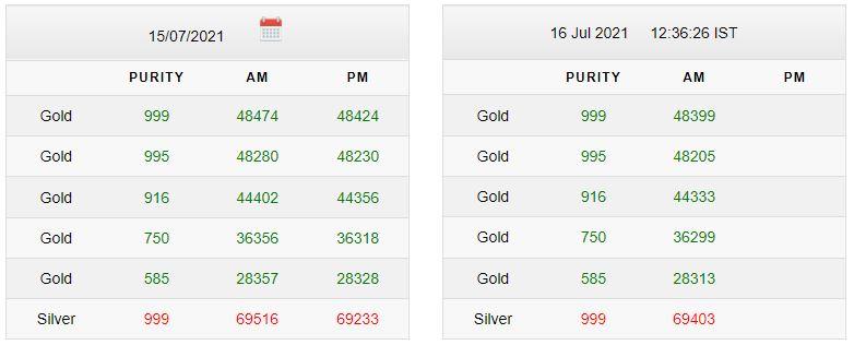 Gold Rate Silver Price Today 16 July 2021: भारतीय बाजार में आज सोने-चांदी की कीमतों में फेरबदल हुआ है. घरेलू बाजार में सोने की कीमत में मामूली गिराटव दर्ज की गई है. वहीं चांदी की कीमत में हल्की तेजी आई है. इंडिया बुलियन एंड ज्वैलर्स एसोसिएशन (India Bullion And Jewellers Association) के मुताबिक शुक्रवार को सोने का भाव 25 रुपये की कटौती के साथ 48399 रुपये प्रति 10 ग्राम पर पहुंच गया है. वहीं चांदी 170 रुपये की चमक के साथ 69403 रुपये प्रति किलो पर पहुंच गई है.