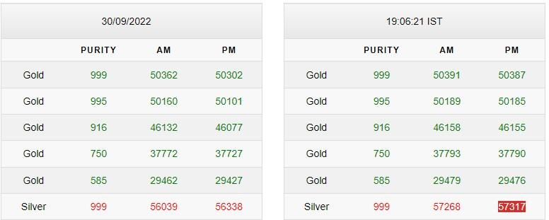 | चांदी (प्रति 1 किलो) | 999 | 57268 | 57317 |