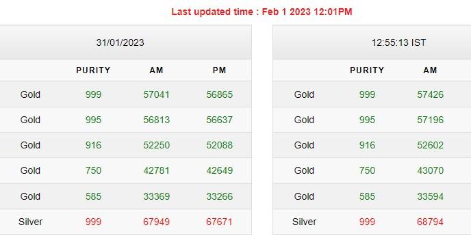इंडिया बुलियन एंड ज्वैलर्स एसोसिएशन (IBJA) की आधिकारिक वेबसाइट ibjarates.com के अनुसार, सर्राफा बाजार में 1 फरवरी की सुबह 999 शुद्धता वाले 24 कैरेट सोने का रेट उछाल के साथ 57426 रुपये प्रति 10 ग्राम जबकि 999 शुद्धता वाली चांदी का रेट महंगा होने के साथ 68794 रुपये प्रति किलो पहुंच गया है.
