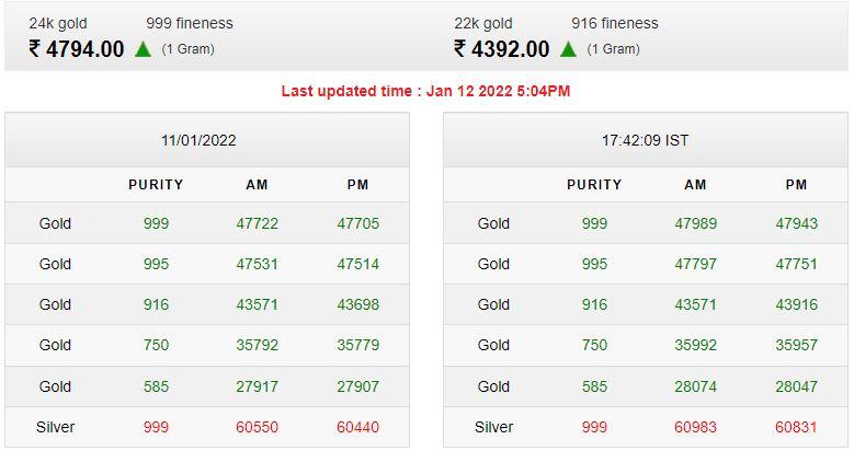 इंडिया बुलियन एंड ज्वैलर्स एसोसिएशन (IBJA) की आधिकारिक वेबसाइट ibjarates.com के अनुसार, 12 जनवरी को सुबह के वक्त 999 शुद्धता वाले 24 कैरेट सोने का रेट (Gold Rate) बीते कारोबारी दिन की तुलना में महंगा होने के साथ 47989 रुपये प्रति 10 ग्राम हो गया है. वहीं, चांदी (Silver Price) भी महंगी होने के साथ 60983 रुपये प्रति किलो पहुंच गई है.