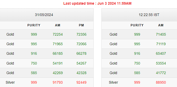 इंडिया बुलियन एंड ज्वैलर्स एसोसिएशन (India Bullion And Jewellers Association) के मुताबिक, शुक्रवार की शाम को 24 कैरेट का शुद्ध सोना 72356 रुपये प्रति 10 ग्राम था, जो आज सुबह 71405 रुपये पर आ गया है. इसी तरह शुद्धता के आधार पर सोना और चांदी दोनों सस्ते हुए हैं.