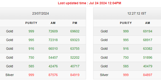 इंडिया बुलियन एंड ज्वैलर्स एसोसिएशन (India Bullion And Jewellers Association) के मुताबिक, मंगलवार (23 जुलाई) की शाम को 24 कैरेट सोना (Gold Rate) 69602 रुपये प्रति 10 ग्राम था जो आज, 24 जुलाई की सुबह गिरावट के साथ 69194 रुपये तक आ गया है. इसी तरह शुद्धता के आधार पर सोना-चांदी दोनों ही सस्ते हुए हैं.