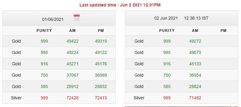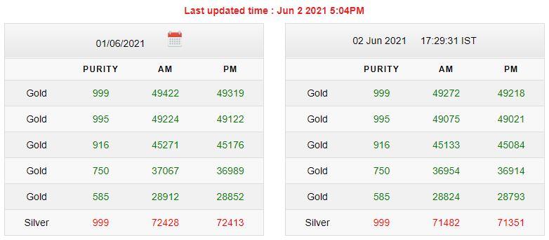 | शुद्धता | सुबह का भाव (रुपये में) | शाम का भाव (रुपये में) | |