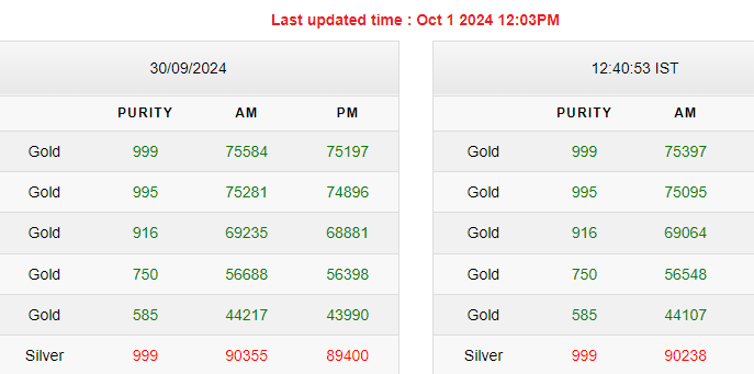 | शुद्धता | सोमवार शाम के रेट | मंगलवार सुबह का भाव | कितने बदले रेट | |