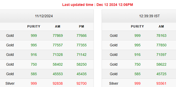 Sona-Chandi Ke Bhav: भारतीय सर्राफा बाजार में आज, 12 दिसंबर, 2024 की सुबह सोना और चांदी की कीमतों में बढ़ोतरी देखने को मिली है. सोना अब 78 हजार रुपये प्रति 10 ग्राम के पार है तो वहीं, चांदी का भाव 93 हजार रुपये प्रति किलो ज्यादा है. राष्ट्रीय स्तर पर 999 शुद्धता वाले 24 कैरेट 10 ग्राम सोने की कीमत 78163 रुपये है. जबकि 999 शुद्धता वाली चांदी (Silver) की कीमत 93562 रुपये है.