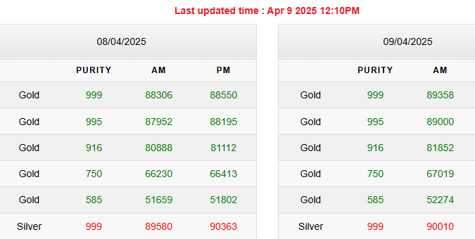 | सोना (प्रति 10 ग्राम) | 999 | 88550 | 89358 | 808 रुपये महंगा |