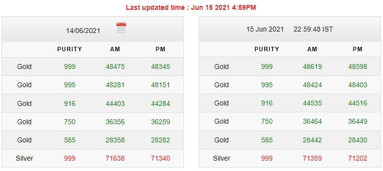 | सोना (प्रति 10 ग्राम) | 999 | 48619 | 48598 |