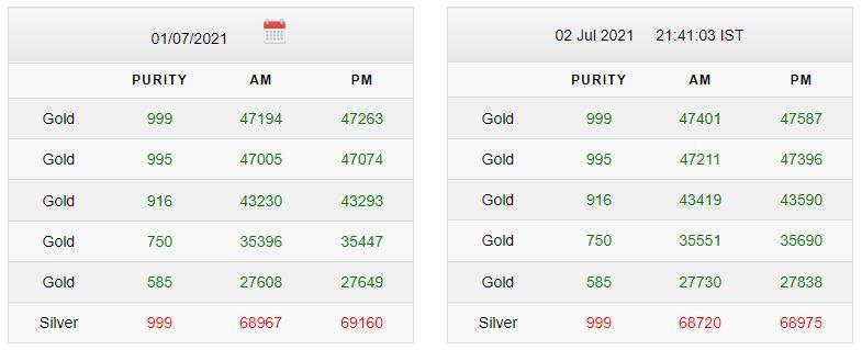 Gold Rate Silver Price Today 02 July 2021: भारत के घरेलू बाजार में शुक्रवार को सोने चांदी की कीमतों में बदलाव दर्ज किए गए. 02 जुलाई को सोने की कीमत में मामूली बढ़त देखी गई. वहीं चांदी के भाव में फिसलन दर्ज की गई.इंडिया बुलियन एंड ज्वैलर्स एसोसिएशन (India Bullion And Jewellers Association) द्वारा जारी कीमतों के मुताबिक 999 शुद्धता वाले 24 कैरट सोने (Gold) का भाव 138 रुपये प्रति 10 ग्राम बढ़कर 47401 रुपये पर पहुंच गया. पिछले कारोबारी दिन सोने का बाजार 47263 रुपये पर बंद हुआ था. शुक्रवार को चांदी बाजार में सस्ता हो गया और 999 शुद्धता वाली चांदी (Silver) का भाव 68720 रुपये प्रति किलो पर पहुंच गया. जो एक दिन पहले 69160 रुपये पर बंद हुआ था.