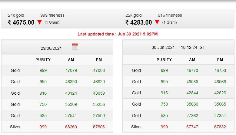 Gold Rate Silver Price Today 30 june 2021: भारतीय बाजार में सोना-चांदी की कीमतों में गिरावट का सिलसिला जारी है. जून महीने के आखिरी दिन आज (बुधवार) सोना और सस्ता हुआ है. इंडिया बुलियन एंड ज्वैलर्स एसोसिएशन (India Bullion And Jewellers Association) के मुताबिक, आज (30 जून) को 999 शुद्धता वाले 24 कैरट सोने (Gold) का रेट 46753 रुपये प्रति 10 ग्राम आ गया है. जिसका भाव एक दिन पहले यानी मंगलावर शाम को 47008 रुपये प्रति 10 ग्राम था. वहीं, चांदी की चमक थोड़ी बढ़ गई है. 999 शुद्धता वाली चांदी (Silver) की कीमत 67832 रुपये प्रति किलो पहुंच गई है, जो कल यानी 29 जून की शाम को 67806 रुपये किलो थी.