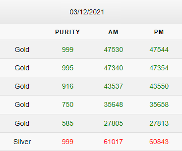 इंडिया बुलियन एंड ज्वैलर्स एसोसिएशन के मुताबिक बीते सप्ताह के आखिरी दिन शुक्रवार को सुबह के मुकाबले शाम के समय सोना की कीमतों में उछाल देखने को मिला. वहीं चांदी के दामों में मामूली गिरावट आई थी. IBJA के अनुसार, 999 शुद्धता वाले 24 कैरेट सोने का रेट सुबह में 47530 रुपये था जो शाम के समय 47544 रुपये प्रति 10 ग्राम हो गया. वहीं, चांदी की कीमत 61017 रुपये प्रति किलो से घटकर 60843 प्रति किलो हो गई.