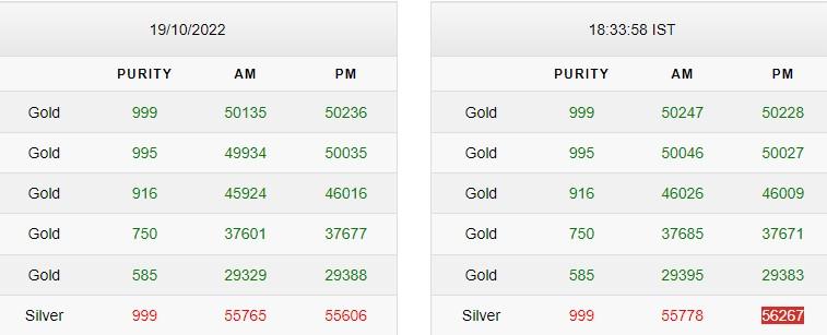Gold-Silver Prices Updates: सोना-चांदी के खरीददारों को बता दें आज, 20 अक्टूबर की सुबह सोने और चांदी दोनों के दाम में तेजी देखी गई है. 999 प्योरिटी वाले दस ग्राम सोने के दाम 50247 रुपये पहुंच गए हैं. जबकि, 999 प्योरिटी वाली एक किलो चांदी की कीमत 55778 रुपये तक जा पहुंची है.