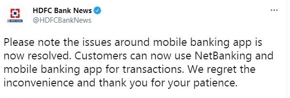 कुछ घंटों की दिक्कत के बाद बैंक ने इसका समाधान कर लिया. बैंक ने ट्वीट कर बताया कि इस समस्या का समाधान हो गया है. ग्राहक अब ट्रांजैक्शन के लिए नेट बैंकिंग और मोबाइल बैंकिंग ऐप का इस्तेमाल कर सकते हैं. इस असुविधा के लिए हमें खेद है. धैर्य बनाए रखने के लिए आपका धन्यवाद.'