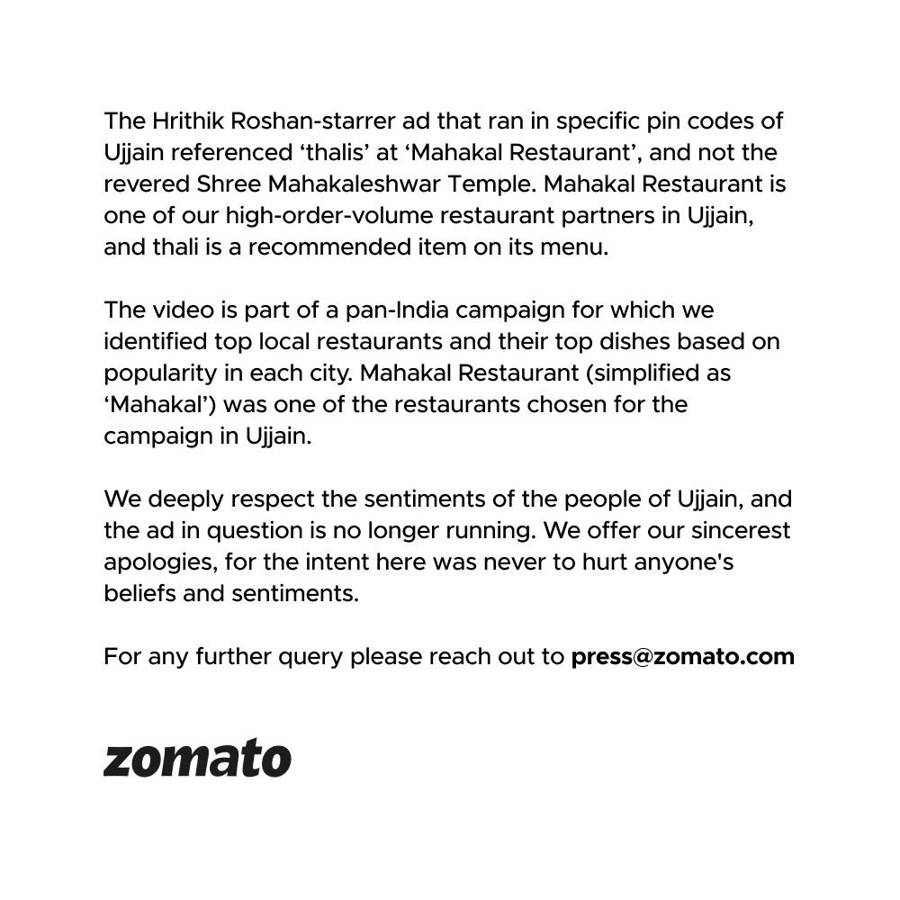जोमेटो ने कहा कि ये हमारे पैन-इंडिया एड कैंपेन का हिस्सा है. इसमें हम स्थानीय लेवल के टॉप रेस्टोरेंट को दिखा रहे हैं. ऋतिक रोशन वाले वीडियो में महाकाल रेस्टोरेंट को आसानी के लिए 'महाकाल' बोला गया है. जोमेटो ने आगे कहा कि हम उज्जैन के लोगों की भावनाओं की कद्र करते हैं और ये विज्ञापन वापस ले रहे हैं. हमारी इच्छा किसी की भावना और आस्था को चोट पहुंचाने की नहीं थी.