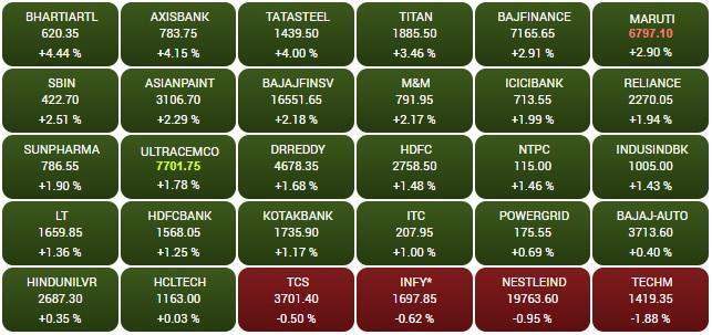 इसी तरह नेशनल स्टॉक एक्सचेंज (NSE) का निफ्टी 70 अंक की तेजी के साथ 16,775.85 पर खुला और और दोपहर 3.18 बजे के आसपास 245 अंकों की उछाल के साथ रिकॉर्ड ऊंचाई स्तर 16,951.50 तक पहुंच गया. कारोबार के अंत में निफ्टी 225.85 अंकों की तेजी के साथ 16,931.05 पर बंद हुआ.