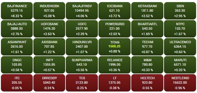 इसी तरह नेशनल स्टाॅक एक्सचेंज का निफ्टी 8 अंक की तेजी के साथ 14,493.80 पर खुला और दोपहर 3.15 बजे के आसपास 182 अंक बढ़कर 14,667.55 पर पहुंच गया. कारोबार के अंत में निफ्टी 168.05 अंकों की तेजी के साथ पर 14,653.05 बंद हुआ.