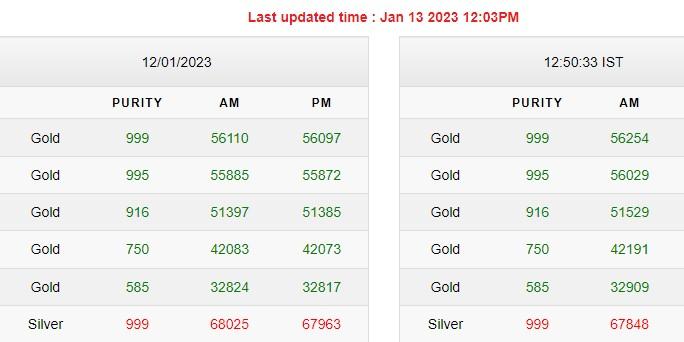Gold Price Today: पिछले कुछ दिनों से सोने के दामों में गिरावट के बाद आज सोने की कीमत एक बार फिर बढ़ी है. हालांकि, चांदी की कीमत में आज भी कमी देखी गई है. भारतीय सर्राफा बाजार में आज यानी 13 जनवरी की ताजा कीमतों के मुताबिक, सोने के दाम 56 हजार के पार और चांदी के कीमत 67 के पार है. राष्ट्रीय स्तर पर 999 शुद्धता वाले 24 कैरेट के 10 ग्राम सोने की कीमत 56254 रुपये है. जबकि 999 शुद्धता वाली चांदी (Silver) के दाम 67848 रुपये हैं.