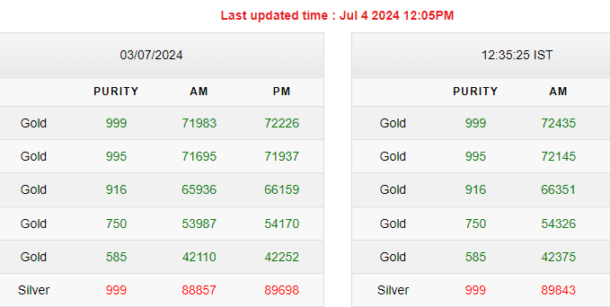 इंडिया बुलियन एंड ज्वैलर्स एसोसिएशन (India Bullion And Jewellers Association) के मुताबिक, बुधवार की शाम को 24 कैरेट का शुद्ध सोना 72226 रुपये प्रति 10 ग्राम था, जो आज (गुरुवार) सुबह महंगा होकर 72435 रुपये पहुंच गया है. इसी तरह शुद्धता के आधार पर सोना और चांदी महंगी हुई है.