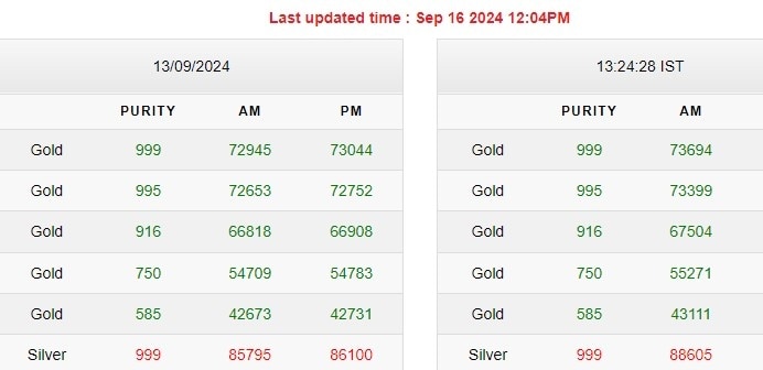 इंडिया बुलियन एंड ज्वैलर्स एसोसिएशन (India Bullion And Jewellers Association) के मुताबिक, शुक्रवार की शाम को 24 कैरेट सोना (Gold Rate) 73044 रुपये प्रति 10 ग्राम था जो आज, 16 सितंबर, 2024 की सुबह तेजी के साथ 73694 रुपये तक पहुंच गया है. इसी तरह शुद्धता के आधार पर सोना-चांदी दोनों ही महंगे हुए हैं.