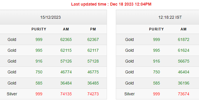 | शुद्धता | शुक्रवार शाम के रेट | सोमवार सुबह का भाव | कितने बदले रेट | |