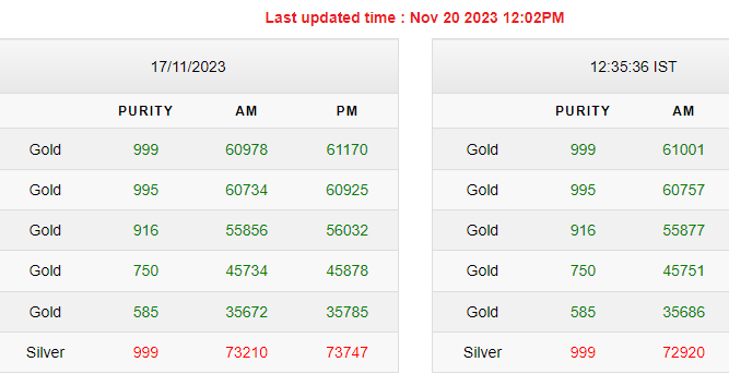 | शुद्धता | शुक्रवार शाम के रेट | सोमवार सुबह का भाव | कितने बदले रेट | |
