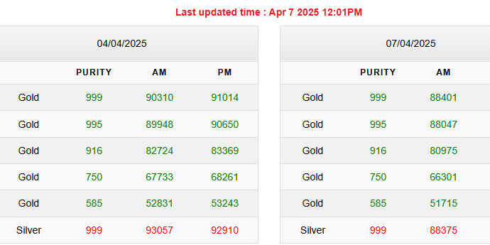 इंडिया बुलियन एंड ज्वैलर्स एसोसिएशन (India Bullion And Jewellers Association) के मुताबिक, शुक्रवार शाम को 24 कैरेट सोना (Gold Rate) 91014 रुपये प्रति 10 ग्राम था, जो आज, 07 अप्रैल, 2025 की सुबह कमी के साथ 88401 रुपये तक आ गया है. इसी तरह शुद्धता के आधार पर सोना-चांदी दोनों ही सस्ते हुए हैं.