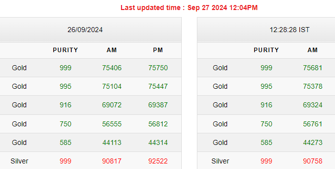 इंडिया बुलियन एंड ज्वैलर्स एसोसिएशन (India Bullion And Jewellers Association) के मुताबिक, गुरुवार (26 सितंबर) की शाम को 24 कैरेट सोना (Gold Rate) 75750 रुपये प्रति 10 ग्राम था जो आज, 27 सितंबर, 2024 की सुबह गिरावट के साथ 75681 रुपये तक आ गया है. इसी तरह शुद्धता के आधार पर सोना-चांदी दोनों ही सस्ते हुए हैं.