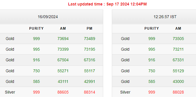 इंडिया बुलियन एंड ज्वैलर्स एसोसिएशन (India Bullion And Jewellers Association) के मुताबिक, सोमवार की शाम को 24 कैरेट का शुद्ध सोना 73489 रुपये प्रति 10 ग्राम था जो आज (मंगलवार), 17 सितंबर की सुबह 73505 रुपये का हो गया है. इसी तरह शुद्धता के आधार पर सोना महंगा और चांदी सस्ती हुई है.