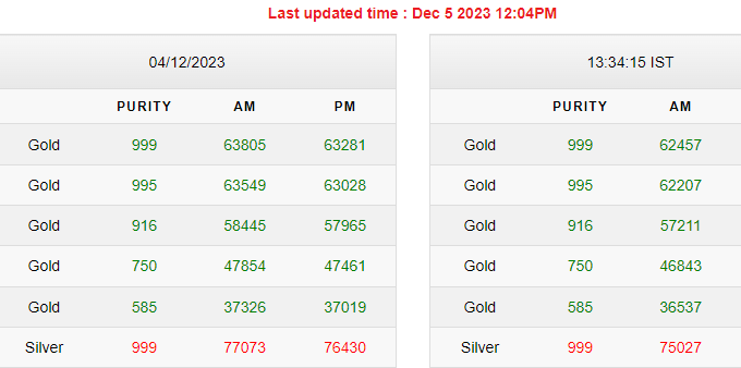 | सोना (प्रति 10 ग्राम) | 999 | 63281 | 62457 | 824 रुपये सस्ता |