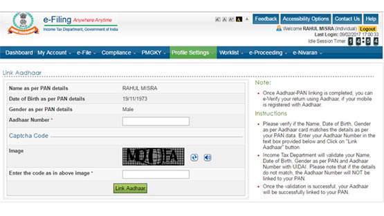 किसी कारण से पॉप अप पेज नहीं खुलता तो आपको लॉग इन करने के बाद सामने दिखने वाले पेज पर इंडेक्स की नीली पट्टी दिखेगी. इस पट्टी पर क्लिक करने पर एक स्क्रोल डाउन खुलेगा जहां LINK AADHAR का ऑप्शन दिखेगा. इस LINK AADHAR पर क्लिक करते ही एक बार फिर आपको ऐसा पेज सामने मिलेगा जहां आप अपने पैन और आधार से जुड़ी जानकारी को भरकर पैन कार्ड और आधार को लिंक करने का काम पूरा कर सकते हैं.