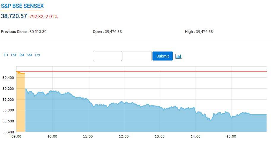 मोदी 2.0 के पहले आम बजट से शेयर बाजार में निराशा बरकरार है. सप्ताह के पहले कारोबारी दिन सोमवार को सेंसेक्स 793 अंक टूटकर 38 हजार 721 के स्तर पर बंद हुआ. वहीं निफ्टी की बात करें तो 253 अंक टूटकर 11 हजार 559 के स्तर पर रहा.