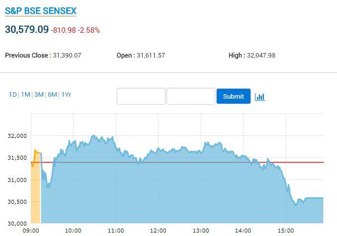 वहीं कारोबार के आखिरी कुछ मिनटों में एक बार फिर बिकवाली लौट आई और सेंसेक्स—निफ्टी बड़ी गिरावट के साथ बंद हुए. कारोबार के अंत में सेंसेक्स 810.98 अंक यानी करीब 2.58 फीसदी लुढ़क कर 30,579.09 अंक पर बंद हुआ. निफ्टी 230.35 अंक लुढ़क कर 8,967.05 अंक पर बंद हुआ.