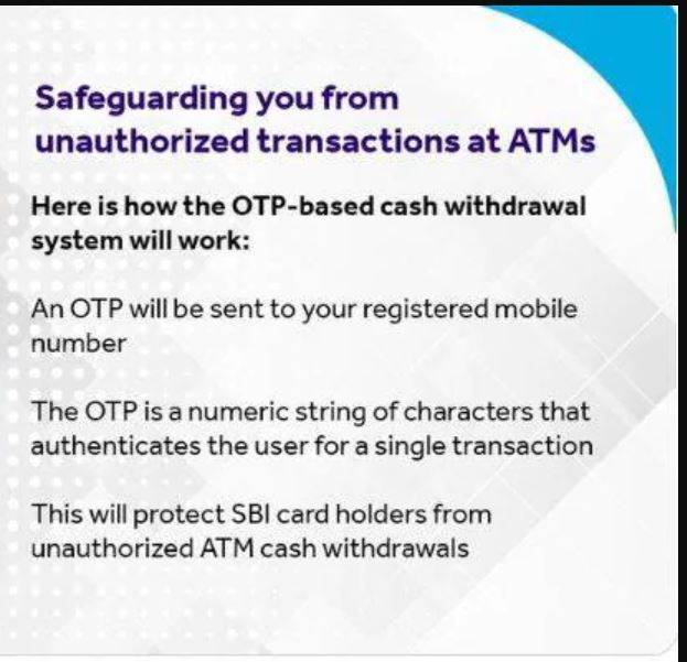 1 जनवरी से भारतीय स्टेट बैंक (SBI) ने कैश निकालने के नियम में बदलाव किया है. नए नियम के तहत आप जब एसबीआई के एटीएम मशीन में कैश निकालने के लिए कार्ड लगाएंगे तो आपके रजिस्टर्ड मोबाइल नंबर पर वन टाइम पासवर्ड (OTP) जनरेट होगा. ओटीपी एंटर करने के बाद ही कैश निकाला जा सकेगा. यह सुविधा 10000 रुपये से ज्यादा के ट्रांजेक्शन के लिए मिलेगी. यहां बता दें कि OTP बेस्ड निकासी सुविधा SBI कार्ड से अन्य बैंक एटीएम से कैश निकासी पर लागू नहीं होगी. वहीं नई सुविधा के तहत अभी सिर्फ सुबह 8 बजे से रात 8 बजे के बीच ही आप ट्रांजेक्शन कर सकते हैं.