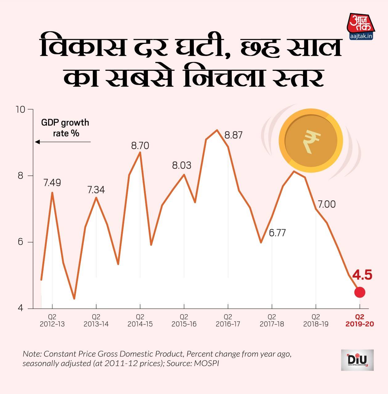 किसी भी देश की आर्थिक सेहत को मापने का सबसे अहम पैमाना जीडीपी ग्रोथ के आंकड़े होते हैं. भारत की जीडीपी ग्रोथ के ताजा आंकड़े बताते हैं कि देश की आर्थिक स्थिति ठीक नहीं है. जीडीपी के आंकड़ों के मुताबिक देश की आर्थिक स्थिति लुढ़क कर 6 साल पहले जैसी हो गई है. दरअसल, चालू वित्त वर्ष (2019-20) की दूसरी तिमाही में जीडीपी का आंकड़ा 4.5 फीसदी पहुंच गया है. यह करीब 6 साल में किसी एक तिमाही की सबसे बड़ी गिरावट है. इससे पहले मार्च 2013 तिमाही में देश की जीडीपी दर इस स्तर पर थी.