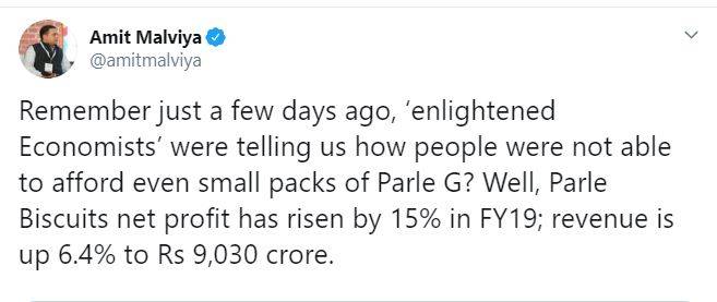 इन आंकड़ों के सामने आने के बाद बीजेपी आईटी सेल के अध्यक्ष अमित मालवीय ने चुटकी ली है. उन्होंने ट्वीट कर कहा, ''कुछ दिनों पहले 'एनलाइटेंड इकनॉमिस्ट' हमें बता रहे थे कि लोग 5 रुपये का पारले जी बिस्किट पैक नहीं खरीद पा रहे हैं? खैर कंपनी का मुनाफा 15.2 फीसदी बढ़ा है और आमदनी भी 6.4 फीसदी बढ़कर 9,030 करोड़ रुपये हो गई है.''