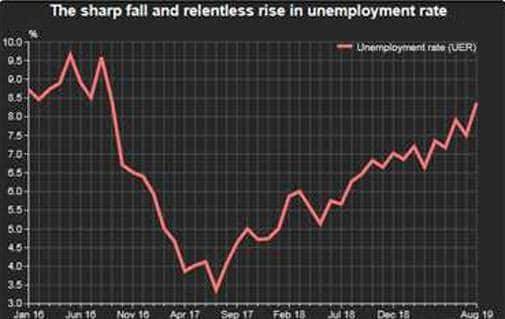 रिपोर्ट के मुताबिक अगस्त में बेरोजगारी की दर 8.4 फीसदी रही, जो तीन साल का उच्चतम स्तर है. इससे पहले सितंबर 2016 में बेरोजगारी के आंकड़े इस स्तर पर पहुंचे थे. रिपोर्ट में अगस्त की साप्ताहिक बेरोजगारी दर के आंकड़े भी बताए गए हैं. इसके मुताबिक महीने के हर हफ्ते में बेरोजगारी की दर 8 से 9 फीसदी के बीच रही.