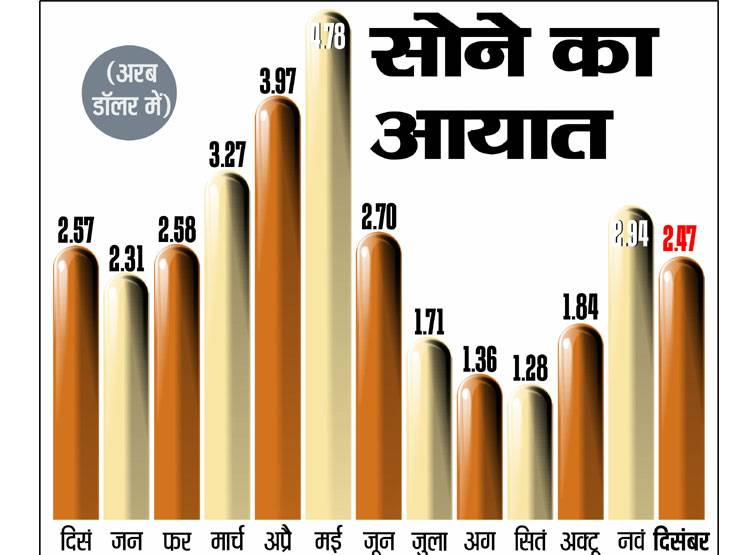 साल 2019 में महीने दर महीने के आधार पर तुलना करें तो आयात कम हुआ है. दिसंबर 2018 में सोने का आयात 2.57 अरब डॉलर था तो वहीं दिसंबर 2019 में यह 2.47 अरब डॉलर रुपये खर्च कर सोना मंगाया गया. साल 2019 में सबसे अधिक मई में सोने के आयात पर खर्च हुआ. इस महीने में 4.78 अरब डॉलर रुपये लग गए. वहीं सबसे बड़ी गिरावट सितंबर 2019 में देखने को मिली. इस महीने आयात पर 1.28 अरब डॉलर रुपये खर्च हुए.