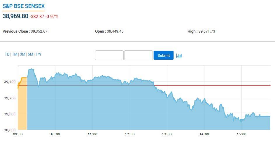 चुनावी नतीजों से पहले मंगलवार को भारतीय शेयर बाजार ने रिकॉर्ड बढ़त के साथ शुरुआत की लेकिन आखिरी घंटों में बिकवाली की वजह से यह 380 अंक से ज्यादा टूट गया. सप्ताह के दूसरे कारोबारी दिन सेंसेक्स 383 अंक टूटकर 38,970 अंक पर रहा जबकि निफ्टी 119.15 अंक के नुकसान से 11,709 अंक के स्तर पर आ गया.