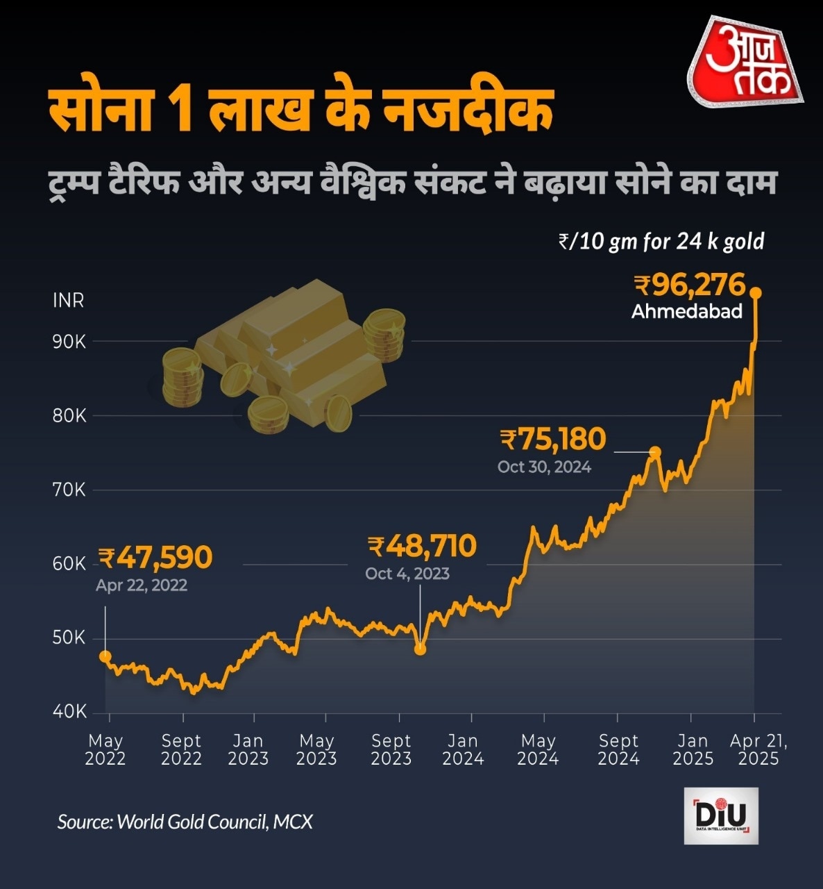 अगर पिछले 10 साल में सोने की चाल देखें तो साल 2015 में 26,343 रुपये से बढ़कर 21 अप्रैल 2025 को 99,800 रुपये तक पहुंच गई है. जिसमें लगभग 15% की संयुक्त वार्षिक वृद्धि दर (CAGR) रही. जो कि निवेशक के नजरिये से भी शानदार है.