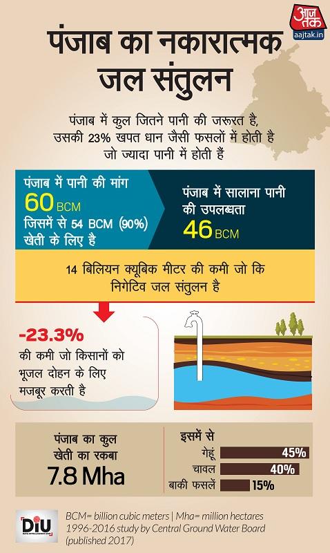ताजा अनुमानों के अनुसार, पंजाब में उपलब्ध जल संसाधनों का लगभग 90 प्रतिशत हिस्सा कृषि में खर्च हो जाता है और बाकी बचा 10 प्रतिशत राज्य की घरेलू, औद्योगिक और पर्यावरणीय जरूरतों को पूरा करता है. पंजाब में सालाना 60 बिलियन क्यूबिक मीटर (BCM) पानी की मांग है और सिर्फ 46 बीसीएम पानी उपलब्ध है. लगातार 14 बिलियन क्यूबिक मीटर पानी का यह वार्षिक घाटा 23 प्रतिशत से ज्यादा नकारात्मक जल संतुलन पैदा करता है.