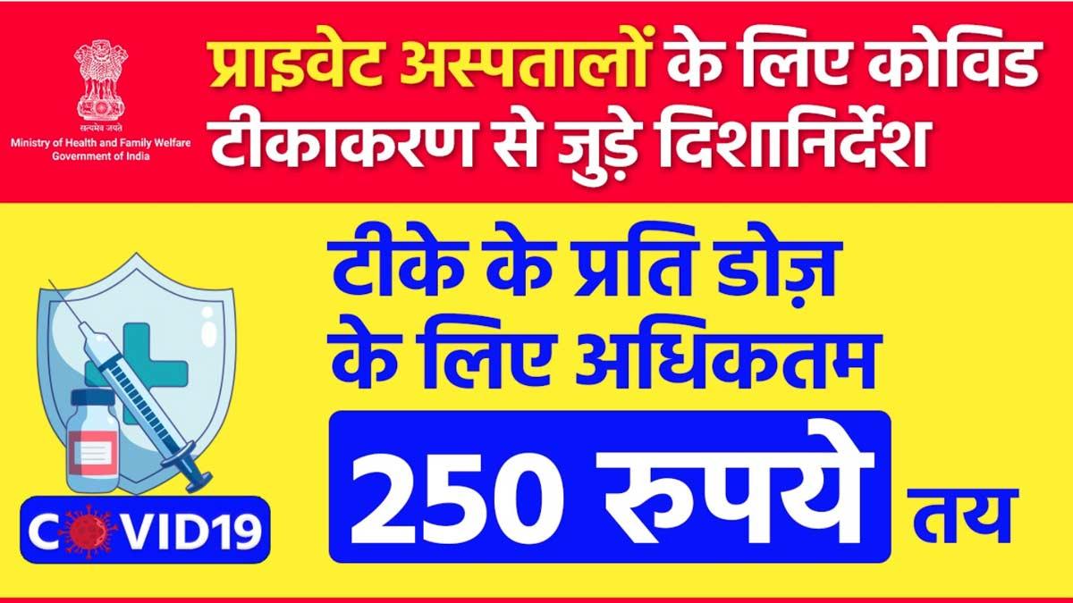 स्वास्थ्य मंत्री डॉक्टर हर्षवर्धन ने ट्वीट कर बताया कि प्राइवेट अस्पतालों में लगने वाले टीके के लिए दिशा-निर्देश जारी कर दिए हैं. इसके तहत वैक्सीन का शुल्क अधिकतम 250 रुपये प्रति डोज तय किया गया है. जबकि सभी सरकारी अस्पतालों में टीका मुफ्त में लगेगा.