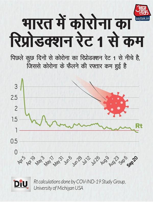 मिशिगन यूनिवर्सिटी के ऐप के अनुसार, भारत में महामारी के बाद से कोरोना का रिप्रोडक्शन रेट 21 सितंबर को पहली बार 1 से नीचे आ गया. मिशिगन यूनिवर्सिटी के कैंसर सेंटर में महामारी विज्ञान के प्रोफेसर भ्रमर मुखर्जी ने इंडिया टुडे को बताया, “मुझे ऐसा लगता है कि वायरस के ग्राफ में वाकई एक आशावादी रुझान है. राष्ट्रीय आंकड़े मुझे उत्साहित कर रहे हैं क्योंकि टेस्टिंग में काफी वृद्धि हुई है.”