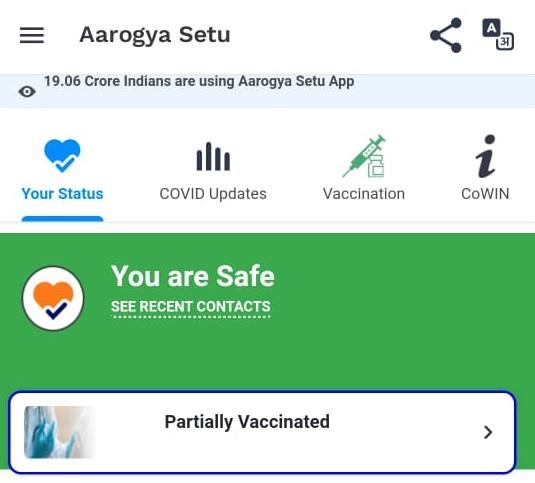 उस ओटीपी नंबर को आरोग्य सेतु ऐप में डालने से खुद ही आपका स्टेटस सामने आ जाएगा. अगर आपको वैक्सीन की एक डोज़ लगी है, तो आपको आरोग्य सेतु पर पार्शियली वैक्सीनेटेड दिखाया जाएगा. उस ऑप्शन पर क्लिक करने के बाद आपको वैक्सीन स्टेटस की जानकारी मिल जाएगी.