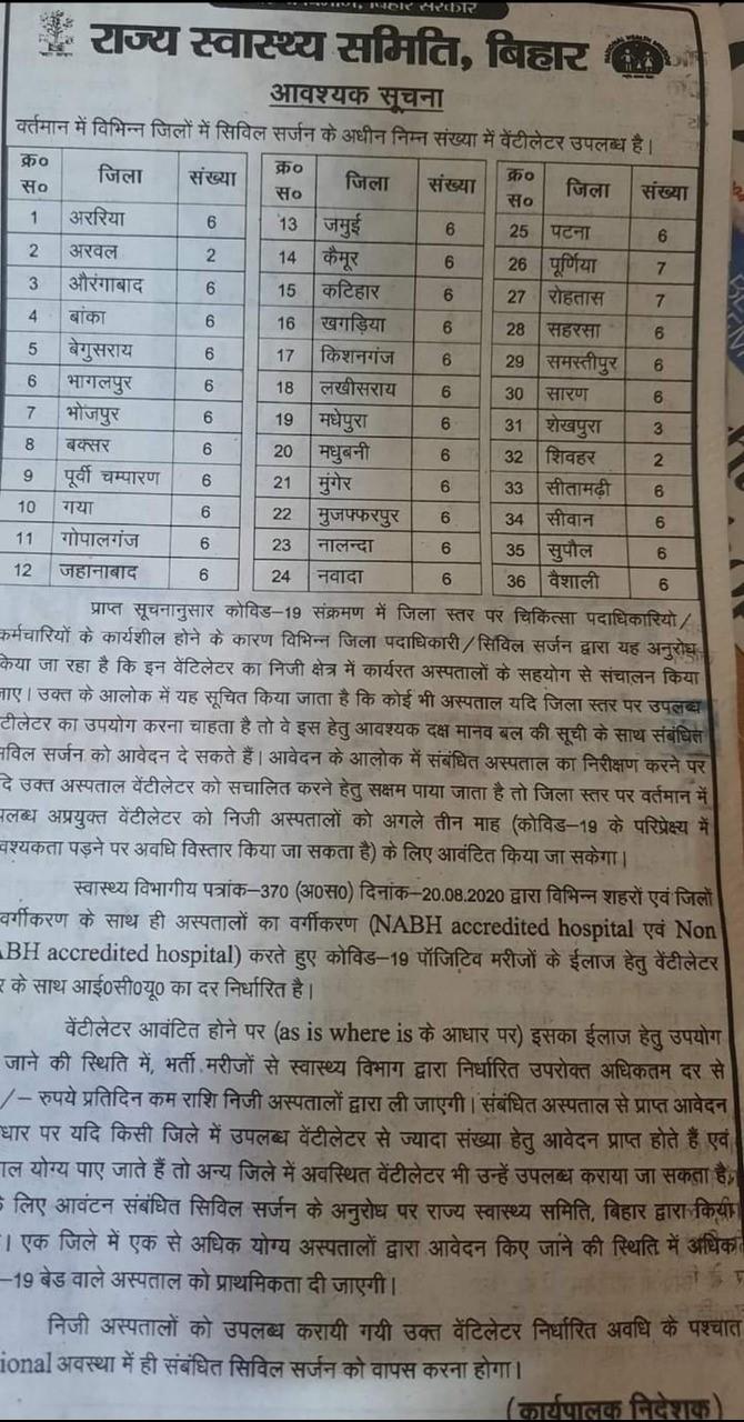 बिहार स्वास्थ्य समिति की तरफ से इसके लिए विज्ञापन जारी कर दिया गया है. इसके जरिए निजी अस्पतालों को वेंटिलेटर लेने के लिए आमंत्रित किया गया है. विज्ञापन में जिलावार उपलब्ध वेंटिलेटर की लिस्ट जारी की गई है. राज्य स्वास्थ्य समिति ने कहा है कि कोरोना संक्रमण में जिला स्तर पर चिकित्सा अधिकारियों और कर्मचारियों के कार्यशील होने की वजह से सिविल सर्जन और डीएम द्वारा अनुरोध किया जा रहा है कि इन वेंटिलेटर का निजी क्षेत्र में कार्यरत अस्पतालों के सहयोग से संचालन किया जाए.