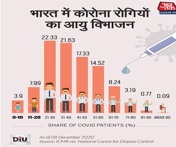 इंडियन काउंसिल ऑफ मेडिकल रिसर्च (ICMR) के आंकड़ों के मुताबिक, Covid-19 वायरस अब तक भारत में 97 लाख से ज्यादा लोगों को संक्रमित कर चुका है. ICMR आंकड़ों के आधार पर नेशनल कोऑपरेटिव डेवलपमेंट कॉरपोरेशन (NCDC) के एक अनुमान के मुताबिक, करीब 12 प्रतिशत संक्रमित आबादी 20 वर्ष से कम उम्र की है. बाकी 88 प्रतिशत संक्रमित लोग 20 वर्ष से ज्यादा उम्र के हैं. ये आंकड़ा 8 दिसंबर, 2020 तक का है.