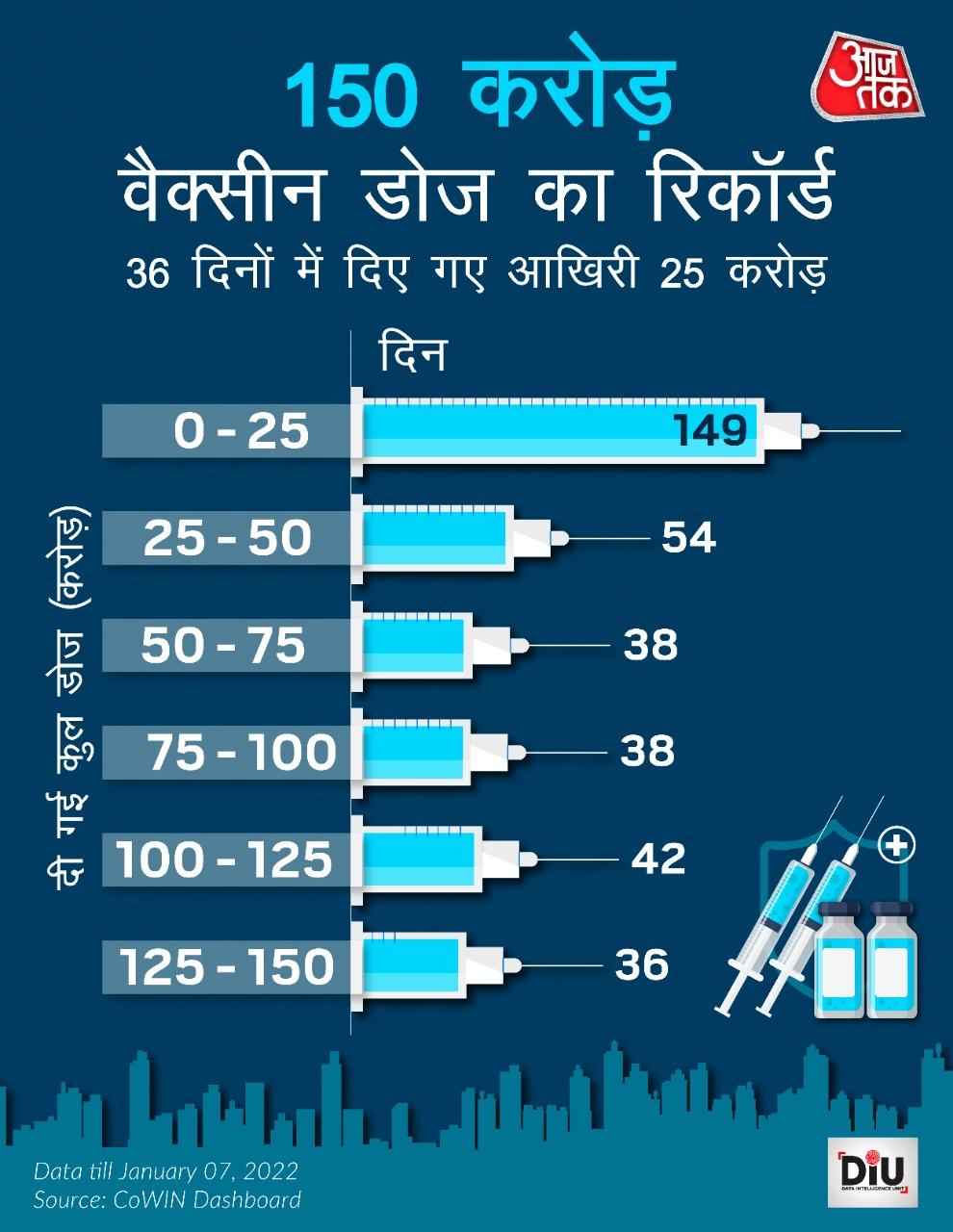 कोरोना के खिलाफ भारत की लड़ाई जारी है. देश ने कोरोना के खिलाफ टीकाकरण में एक महत्वपूर्ण उपलब्धि हासिल कर ली है. देश में अब तक 150 करोड़ खुराक दी जा चुकी है. शुरुआत में थोड़ा धीमा रहने के बाद भारत में टीकाकरण अभियान ने अगस्त 2021 में गति पकड़ी थी. अभियान के लिए सितंबर का महीना सबसे अच्छा रहा था, जिसमें करीब 24 करोड़ लोगों को वैक्सीन लगाई गई थी. 1 दिसंबर से रोजाना औसतन 68 लाख लोगों को वैक्सीन लगाई जा रही है. पिछले साल 25 करोड़ वैक्सीन 36 दिनों के रिकॉर्ड समय में लगाए गए थे.
