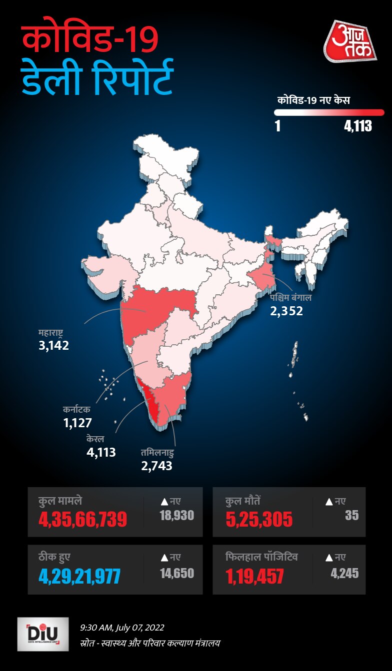 भारत में पिछले 24 घंटे में कोरोना के 18930 केस सामने आए हैं. इसके अलावा 35 लोगों की महामारी से मौत हो गई. एक्टिव केस भी बढ़कर 1,19,457 हो गए हैं. जबकि पॉजिटिविटी रेट 4.32% हो गया है.