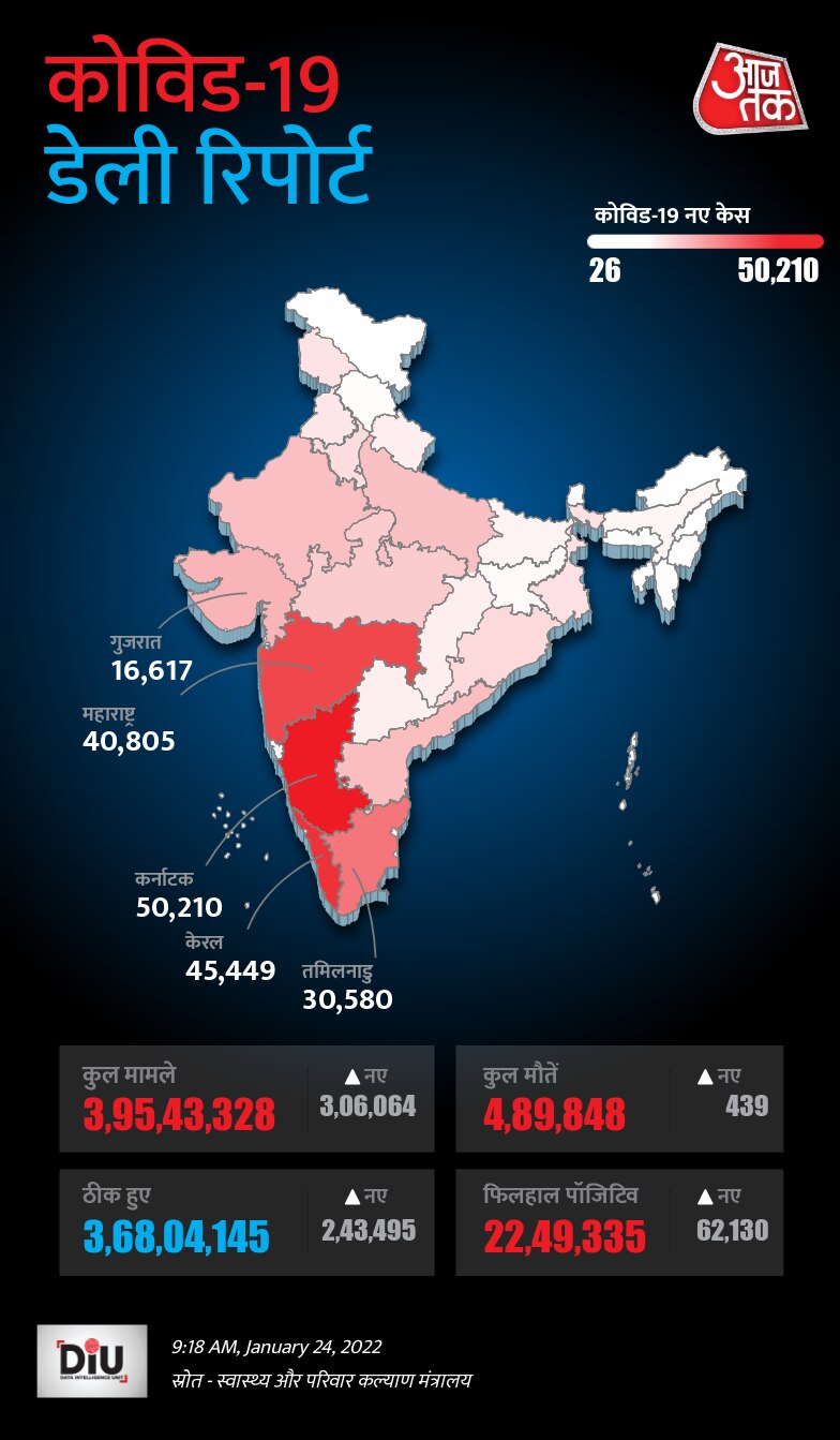बीते 24 घंटे में कोरोना के सबसे ज्यादा केस कर्नाटक में मिले हैं. यहां 50,210 नए मरीज सामने आए हैं. जबकि केरल में 45,449, महाराष्ट्र में 40,805, तमिलनाडु में 30,580 और गुजरात में 16,617 नए मरीज मिले हैं. देश के कुल मरीजों में 60.01% नए मामले इन पांच राज्यों से सामने आए हैं. अकेले कर्नाटक 16.41 फीसदी नए मरीज हैं.