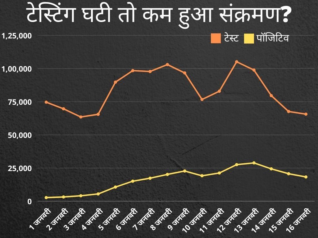 - लेकिन दिल्ली सरकार के आंकड़े बताते हैं कि राजधानी में टेस्टिंग कम हो रही है. दिल्ली में 13 जनवरी को सबसे ज्यादा 28,867 मामले सामने आए थे. उस दिन 98,832 टेस्ट हुए थे. इसके बाद 14 जनवरी को 79,578 और 15 जनवरी को 67,624 लोगों की जांच हुई.